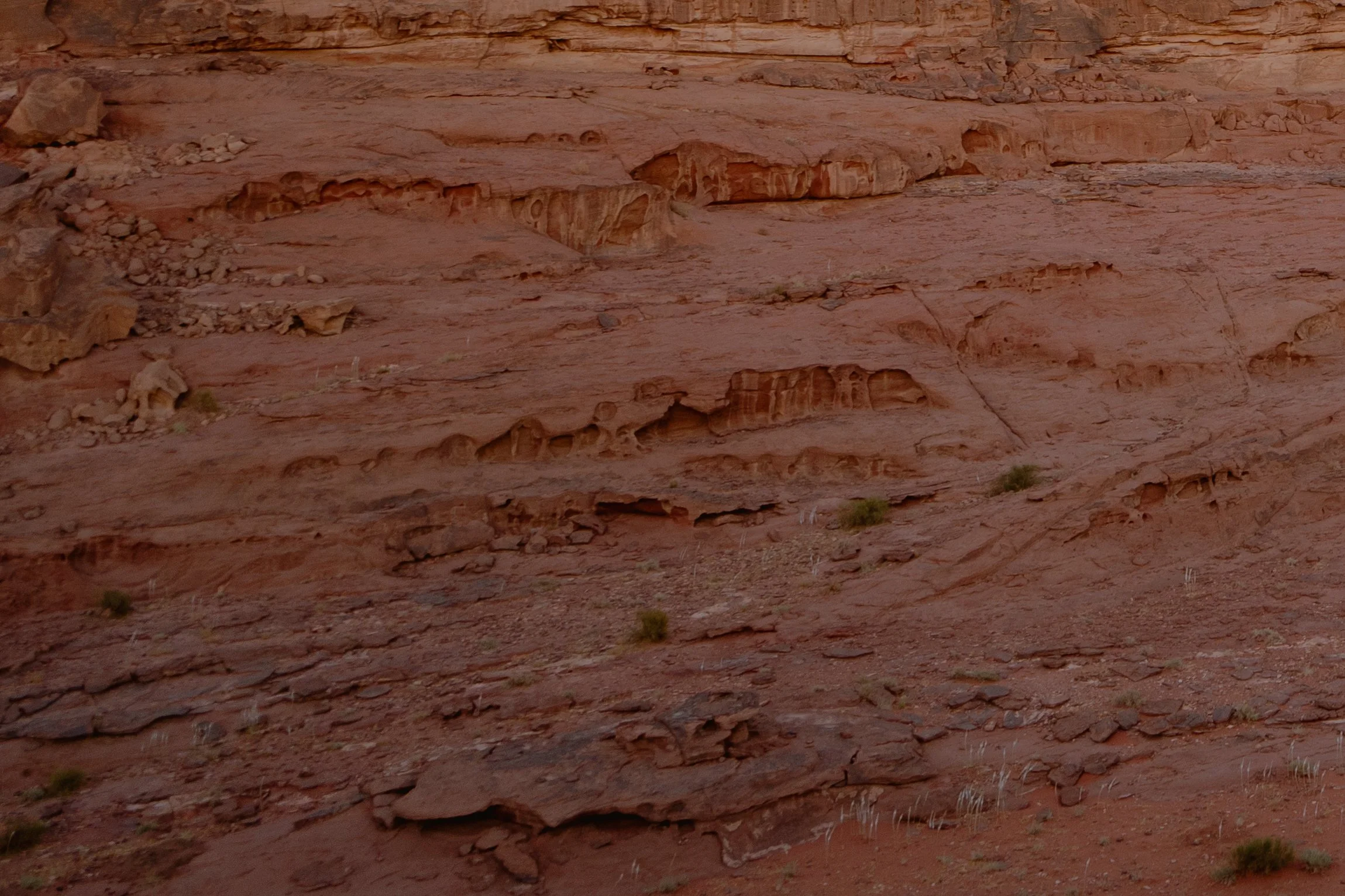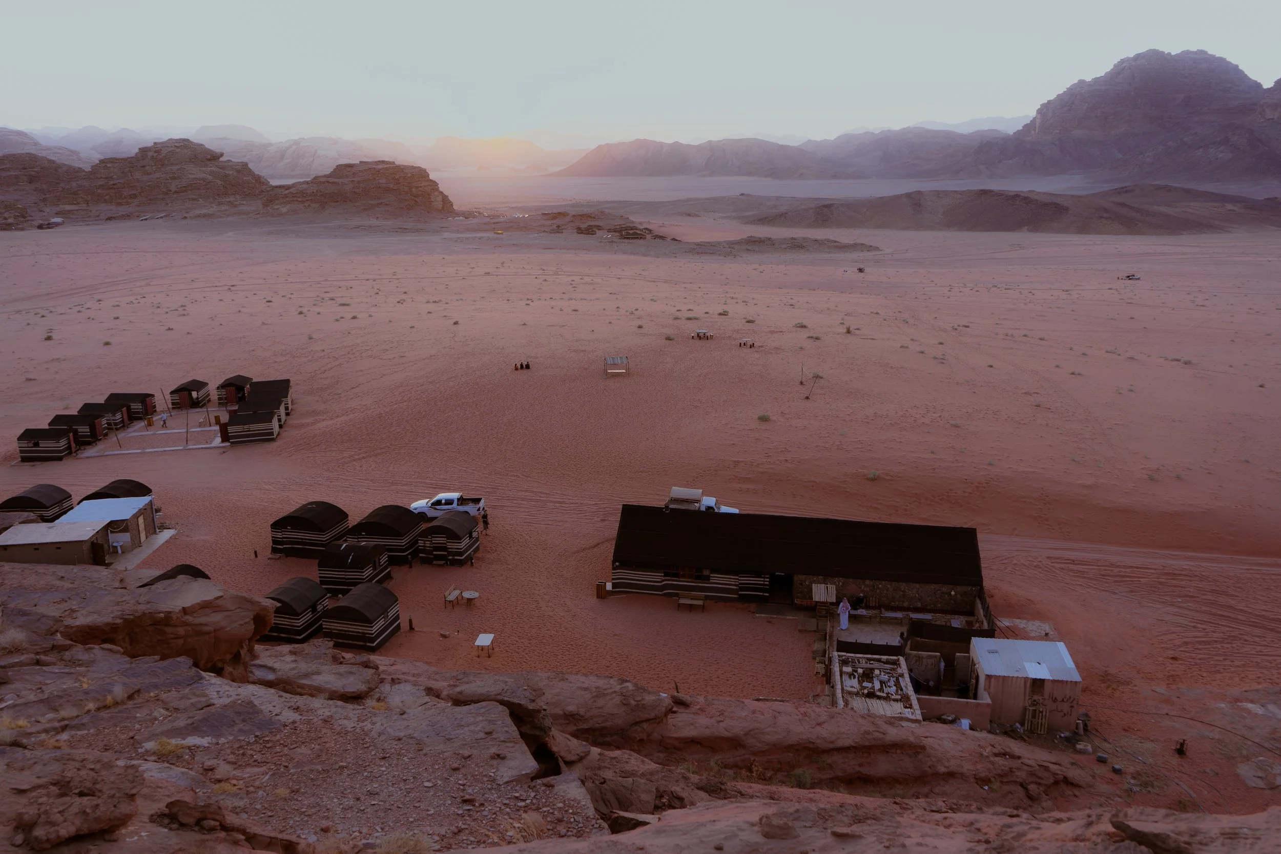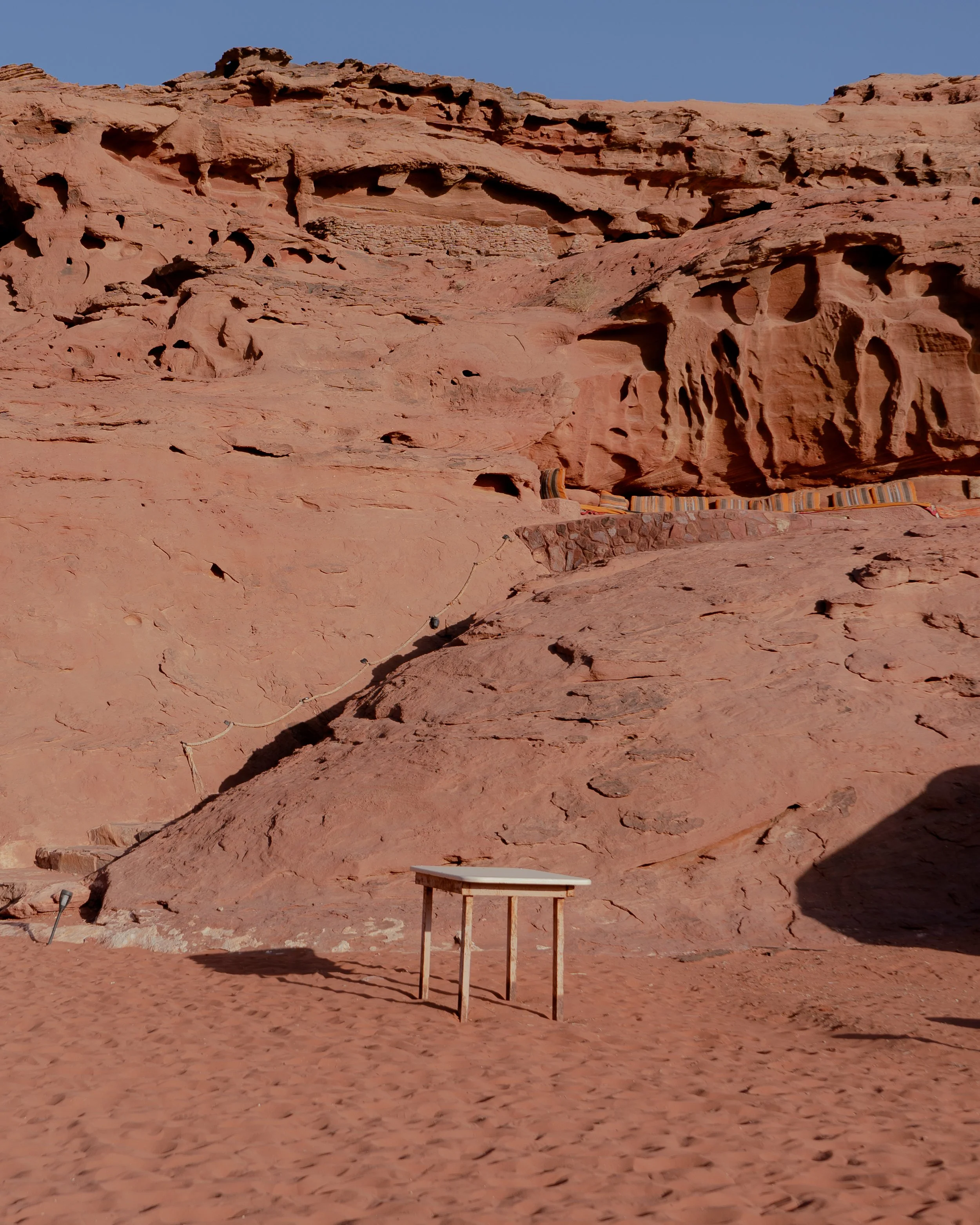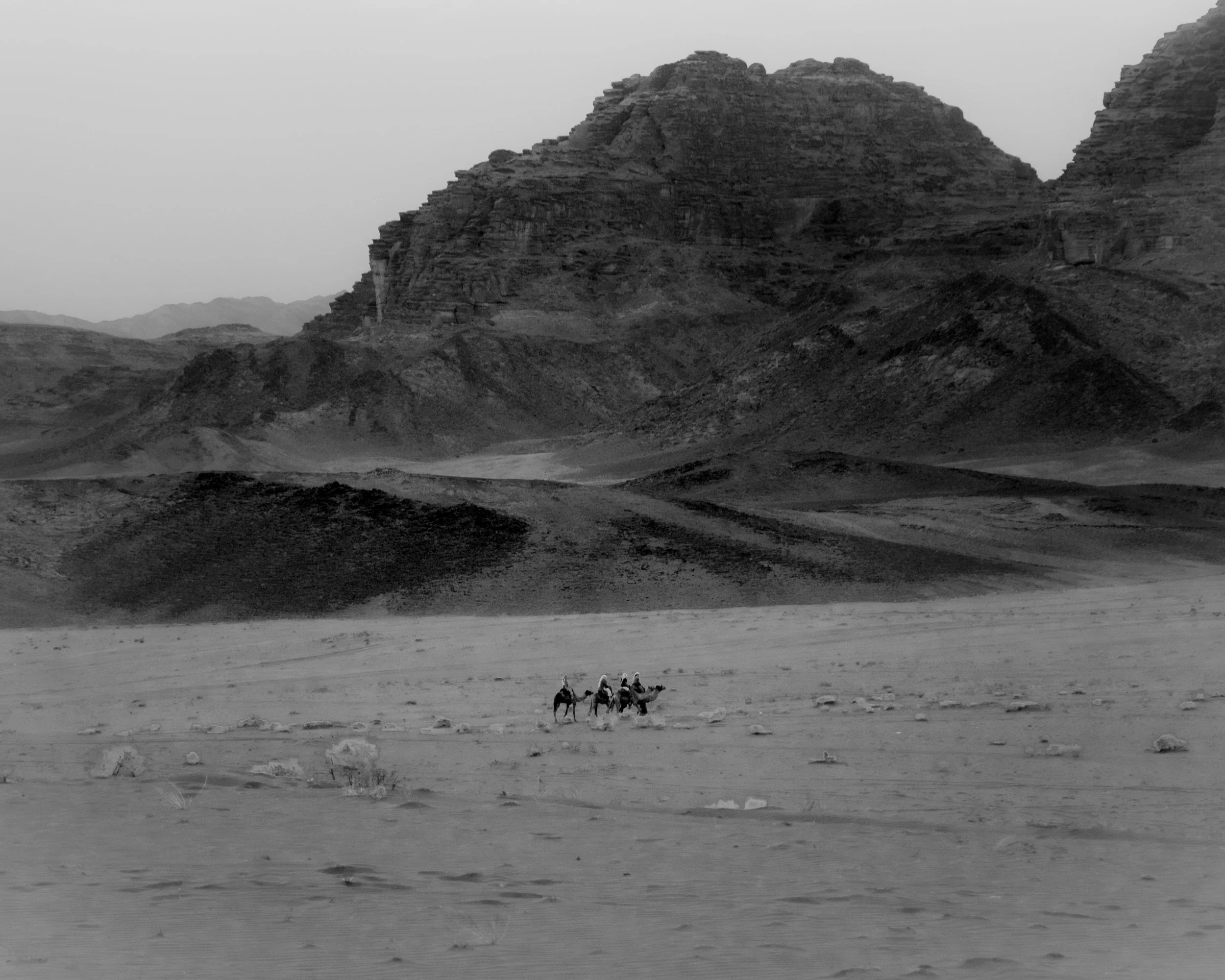 In October I spent five days working at a Bedouin camp with my friend Ella, where we were given a mattress, a tent, and food such as flatbreads, hummus and Zaarb, a traditional Bedouin dinner, in return for photography work and kitchen duty. Wadi Rum is a desert valley in Southern Jordan, floored in red and white sands and walled in by rock cliffs and mesas of sandstone and granite. I was thrilled to be going into this foreign landscape which I had first encountered as a child in the film ‘Lawrence of Arabia’. It was unlike any landscape I had ever travelled and was eager to see it through the lens of my own camera… .